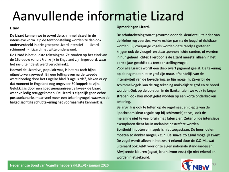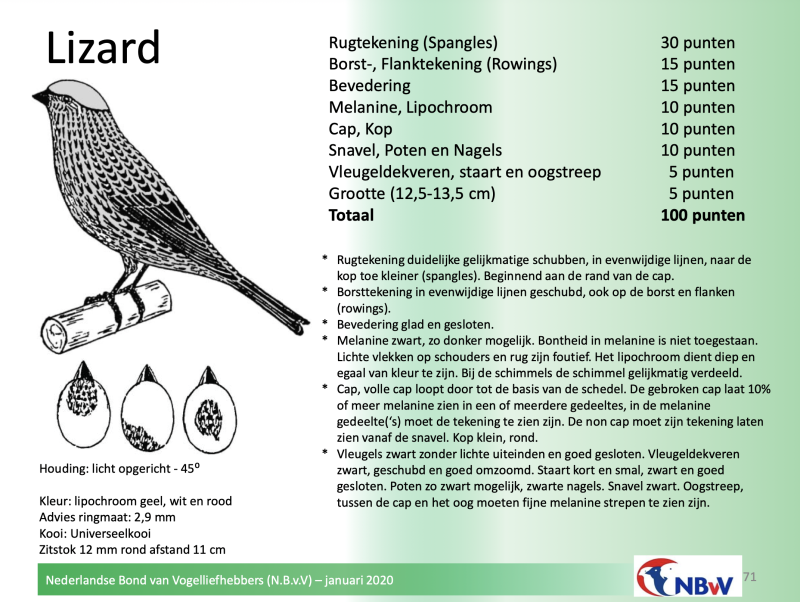 De puntentoekenning is in 2020 gewijzigd door de C.O.M.. De bestreping op zowel rug als borst telt voortaan zwaarder. Het is het belangrijkste kenmerk van de Lizard-kanarie. Vanaf 2020 geldt navolgende waardering: